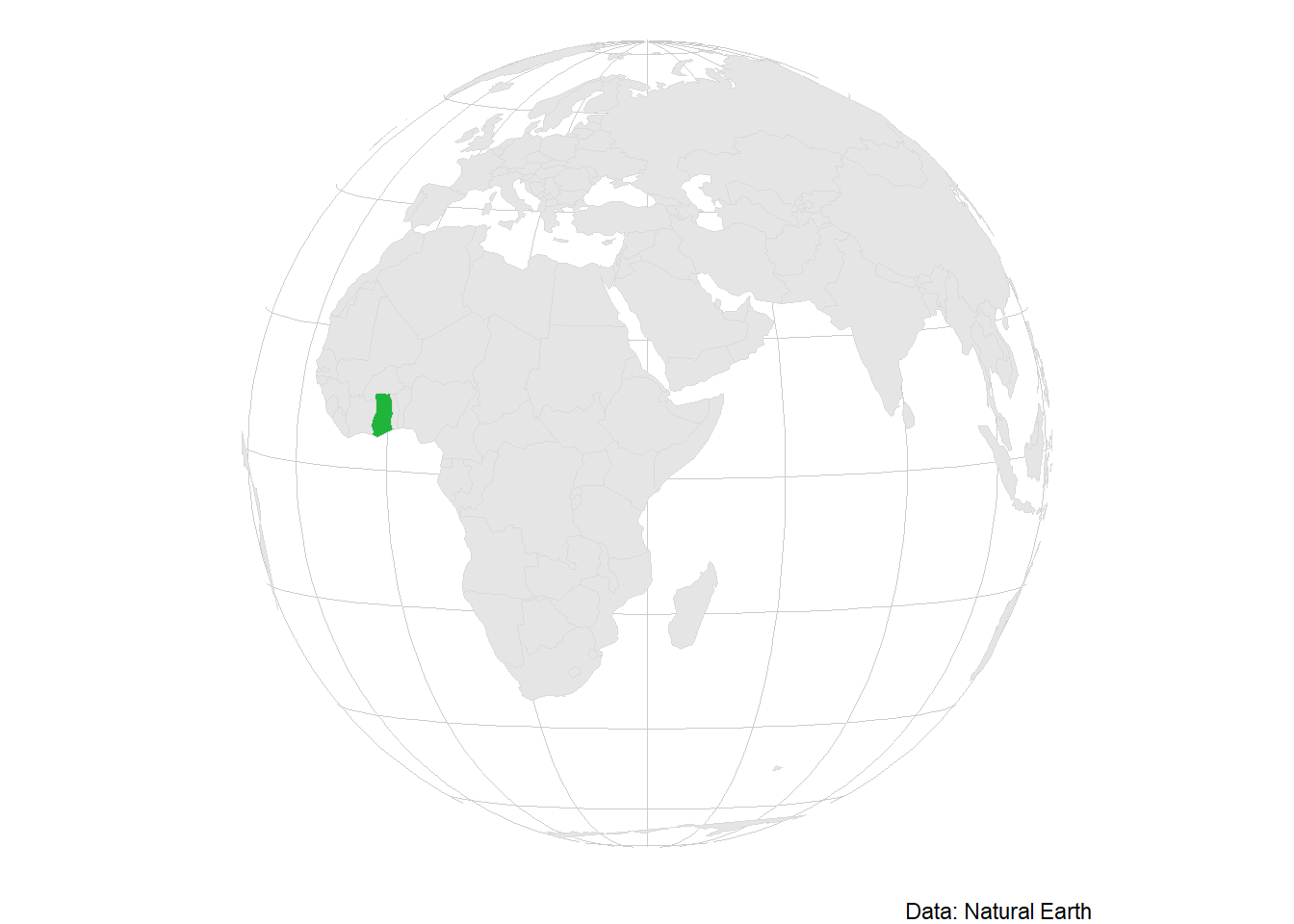 Sometimes I visualize data on a country that not everyone is familiar with. In this case, a locator map can be helpful: It shows where in the world my country of interest is. Here, I’ll show you how to create such a locator map for Ghana.